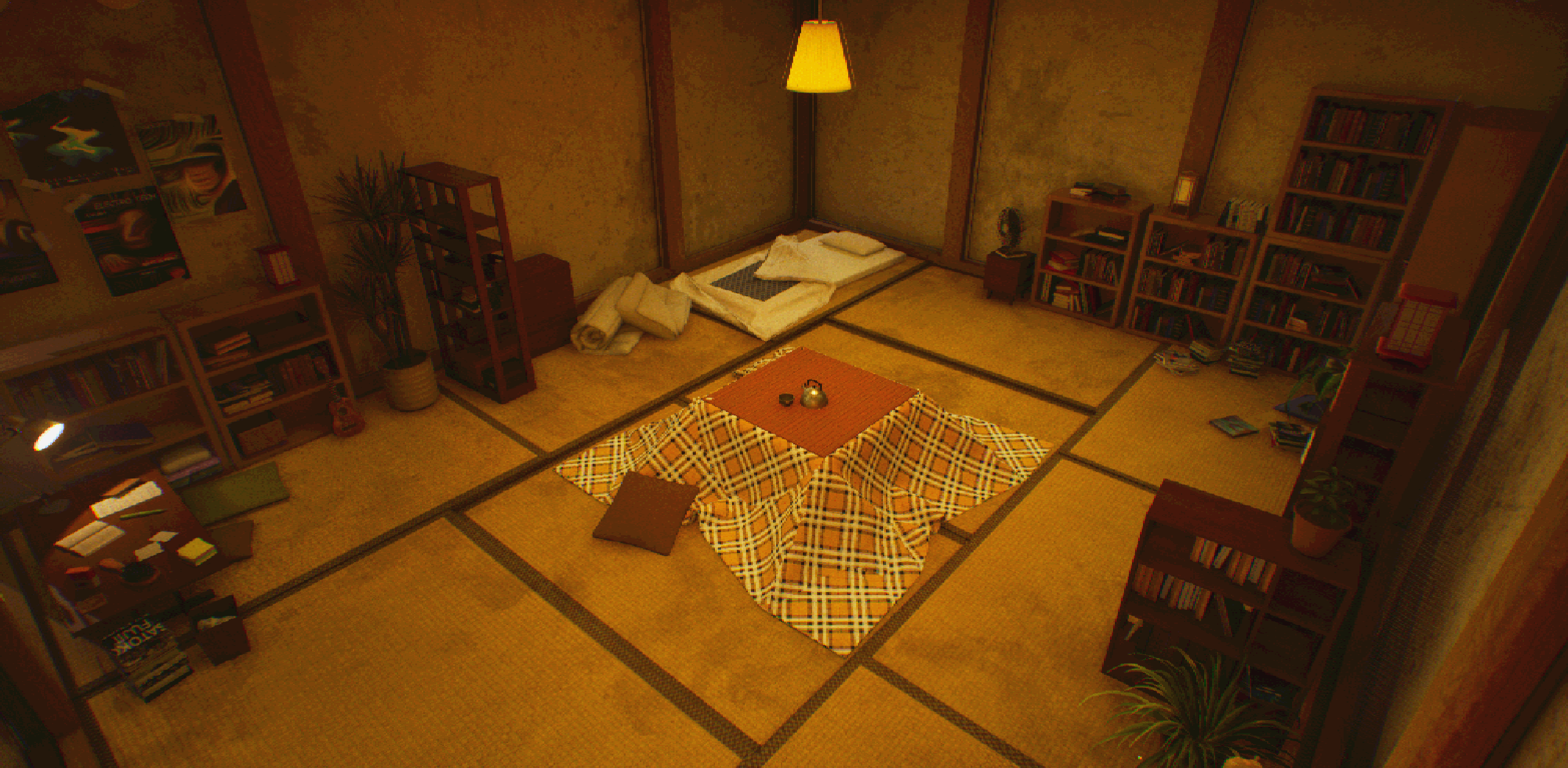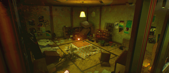 Enter an underground bunker where there lies a glass cage designed to mimic a real bedroom. Although no person is seen, the environment depicts the state of the room when there was someone living inside.